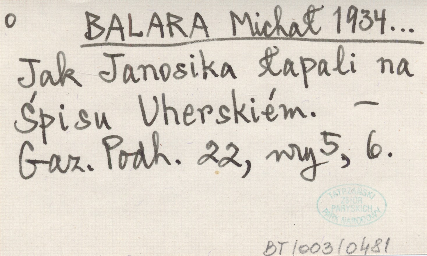 BALARA Michał 1934... Jak Janosika łapali na Śpisu Uherskiém.