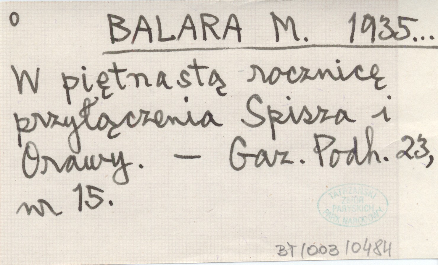 BALARA M. 1935... W piętnastą rocznicę przyłączenia Spisza i Orawy.