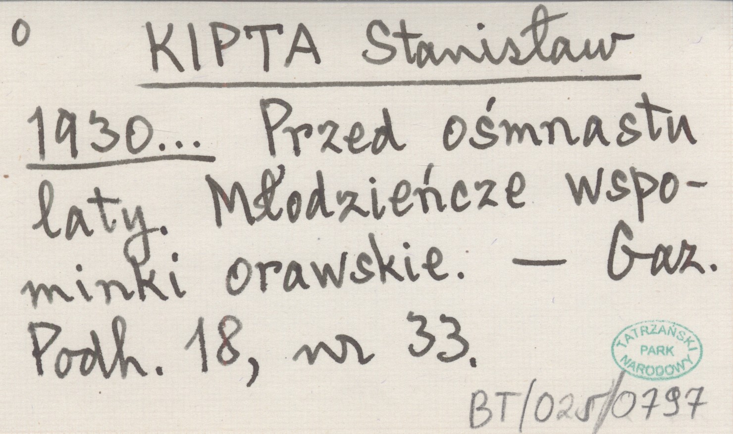 KIPTA Stanisław 1930... Przed ośmnastu laty. Młodzieńcze wspominki orawskie.