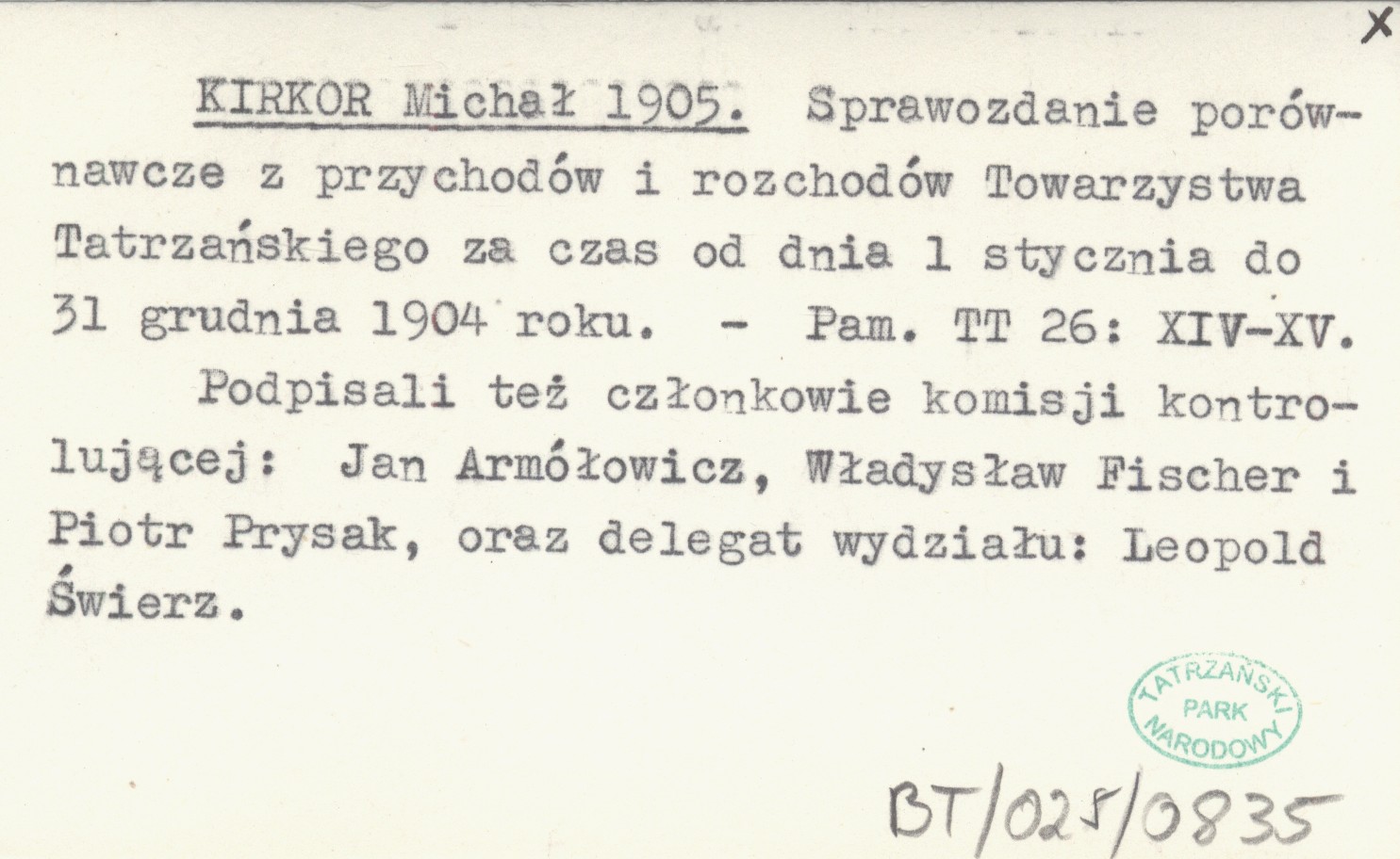 Pamiętnik Towarzystwa Tatrzańskiego, 26: 14-15. Podpisali też członkowie komisji kontrolującej: Jan Armółowicz, Władysław Fischer i Piotr Prysak, oraz delegat wydziału: Leopold Świerz.