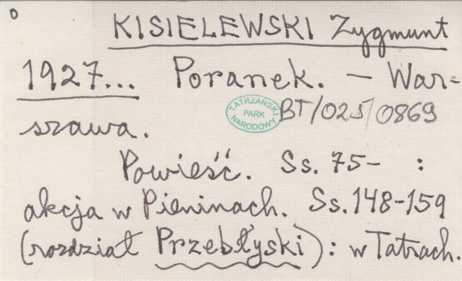 Warszawa , Powieść. S. 75- : akcja w Pieninach. S. 148-159 (rozdział Przebłyski): w Tatrach.