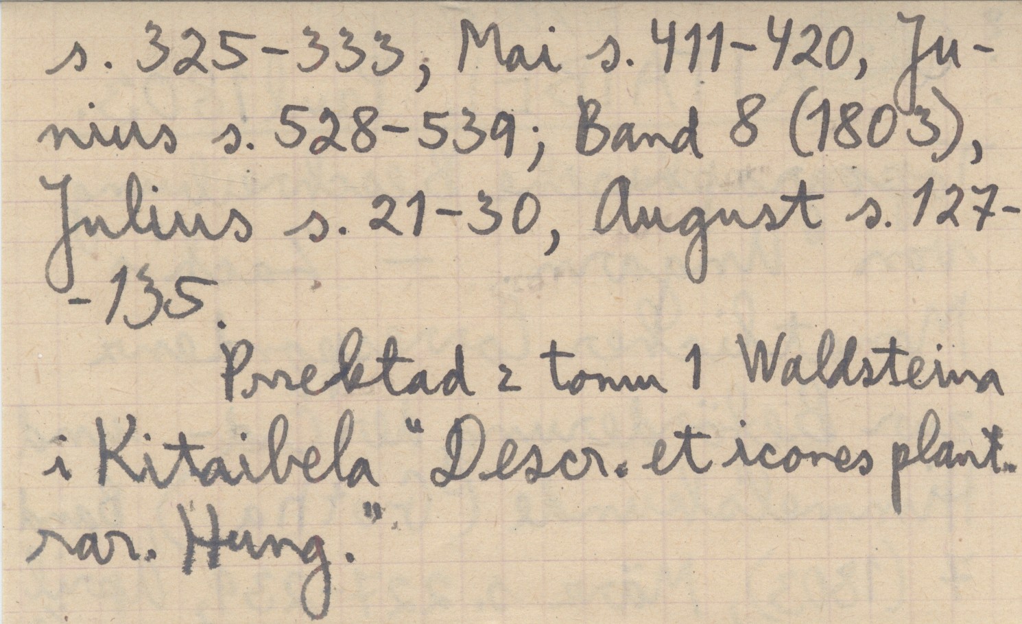 Zach's Monatlicher Correspondenz zur Beförderung der Erd- und Himmelskunde (Gotha) , Band 7 (1803), März s. 227-239, April s. 325-333, Mai s. 411-420, Junius s. 528-539; Band 8 (1803), Julius s. 21-30, August s. 127-135. Przekład z tomu 1 Wallsteina i Kitaibela "Descr. et icones plant. rar. Hung.".