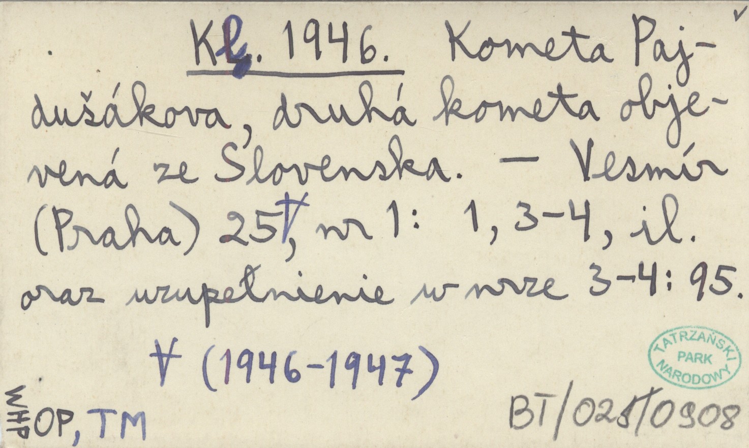 Kl. 1946 Kometa Pajdušákova, druhá kometa objevená ze Slovenska.