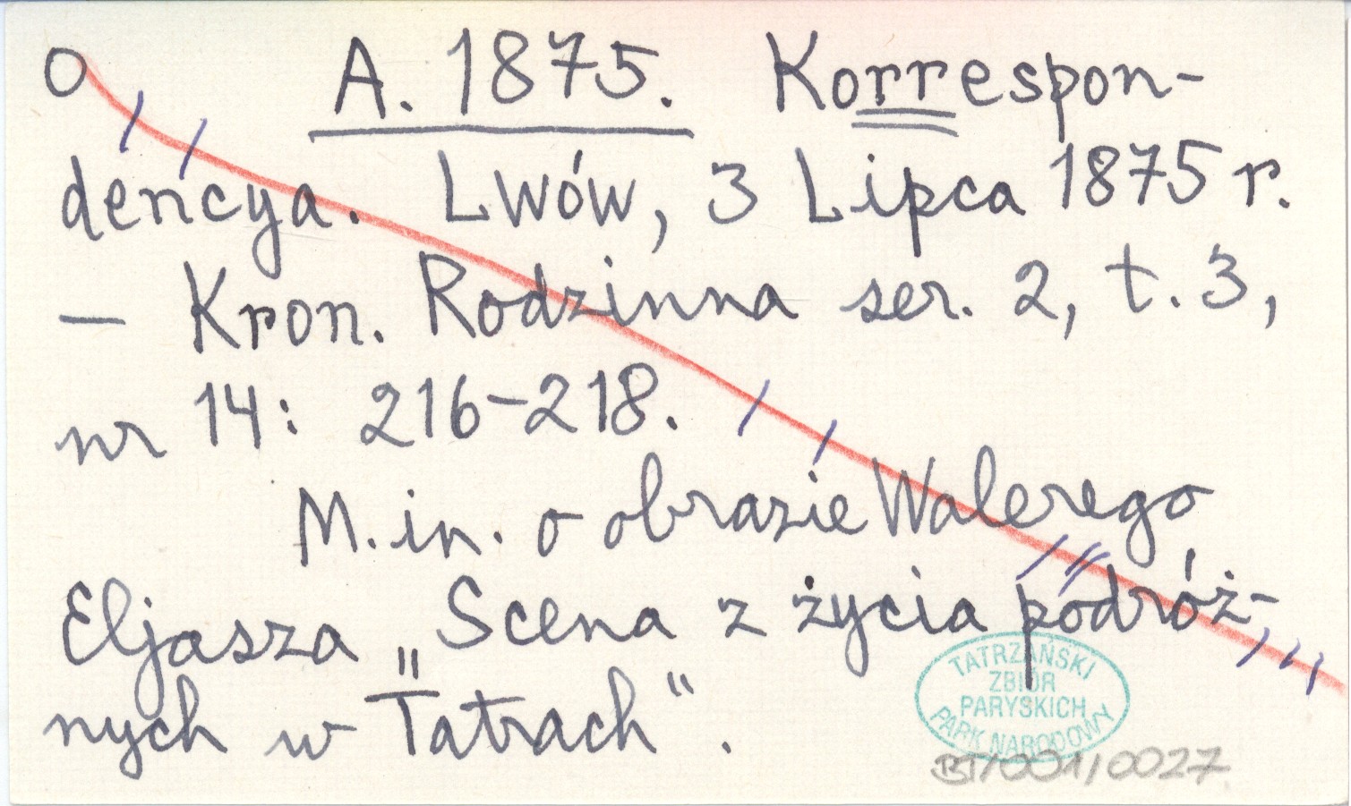 Kronika Rodzinna, Ser. 2, t. 3, nr 14: 216-218. M. in. o obrazie Walerego Eljasza "Scena z życia podróżnych w Tatrach".