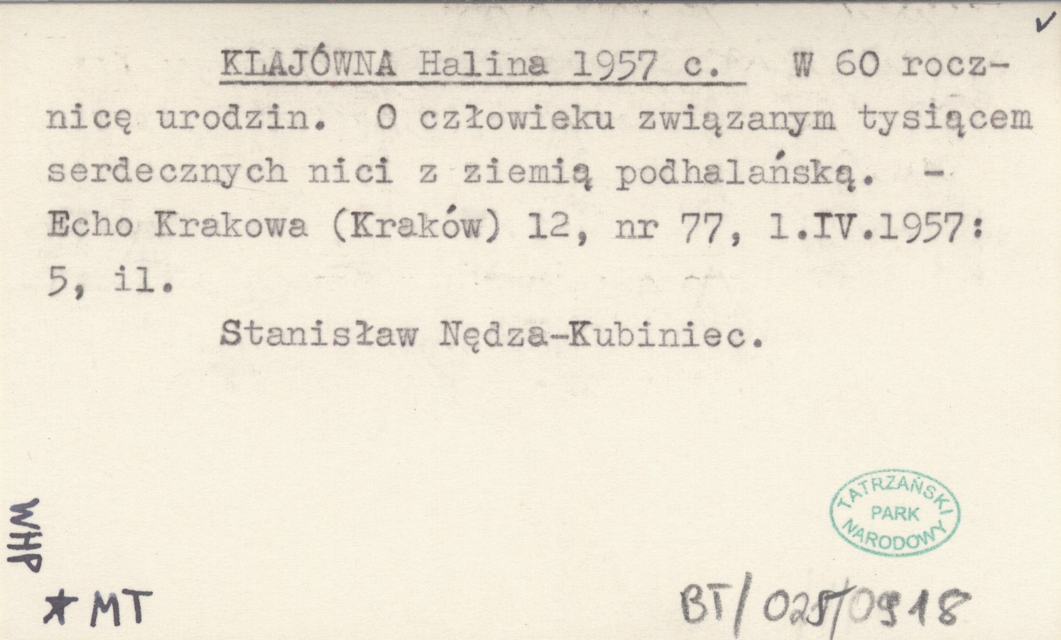 KLAJÓWNA Halina 1957 c W 60 rocznicę urodzin. O człowieku związanym tysiącem serdecznych nici z ziemią podhalańską.