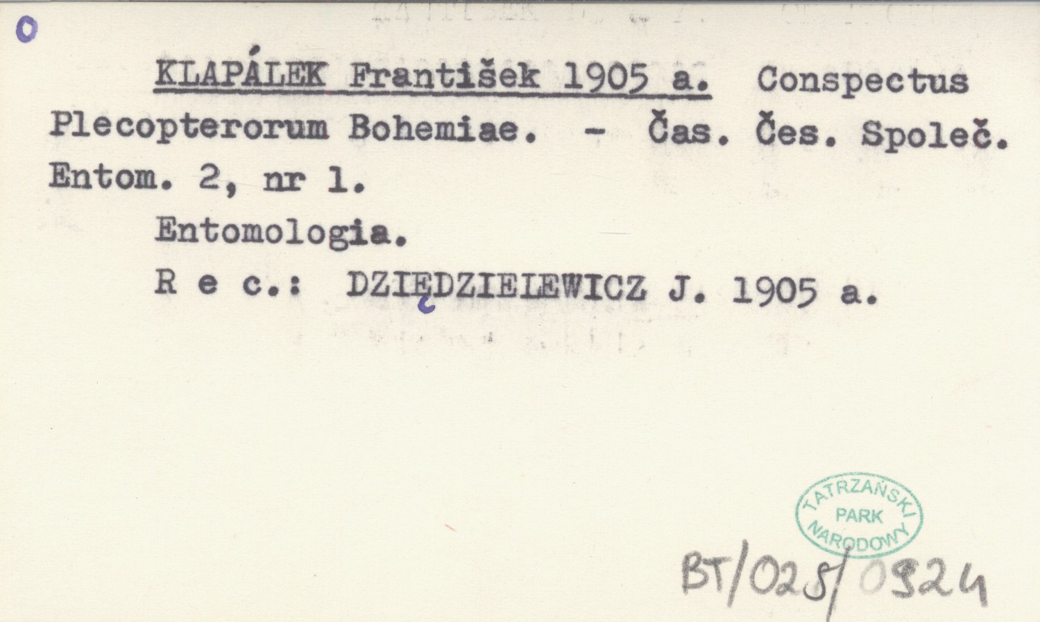 KLAPÁLEK František 1905 a Conspectus Plecopterorum Bohemiae.