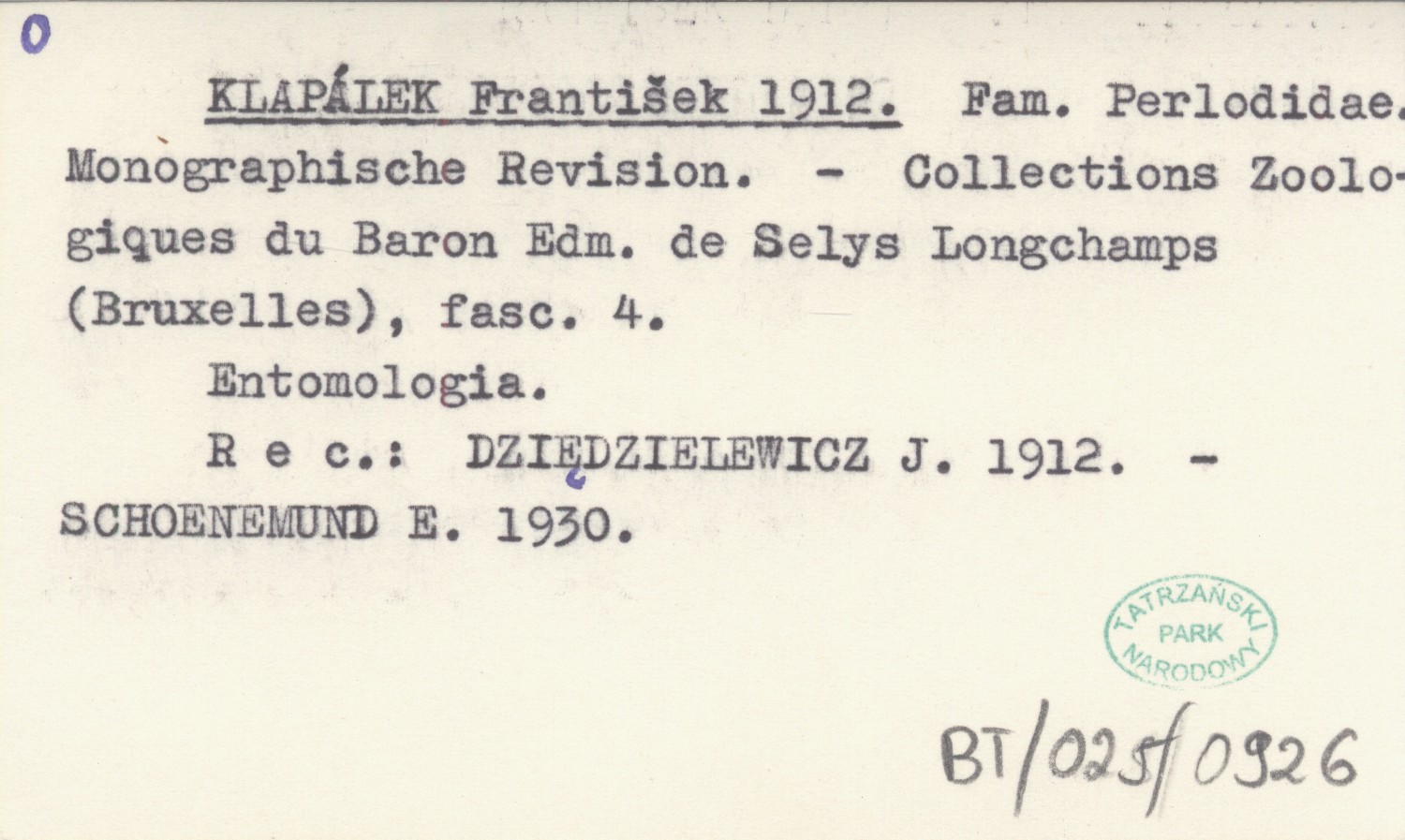 Collections Zoologiques du Baron Edm. de Selys Longchamps (Bruxelles) , Fasc. 4. Entomologia. REC: DZIĘDZIELEWICZ J. 1912 ; SCHOENEMUND E. 1930 ;