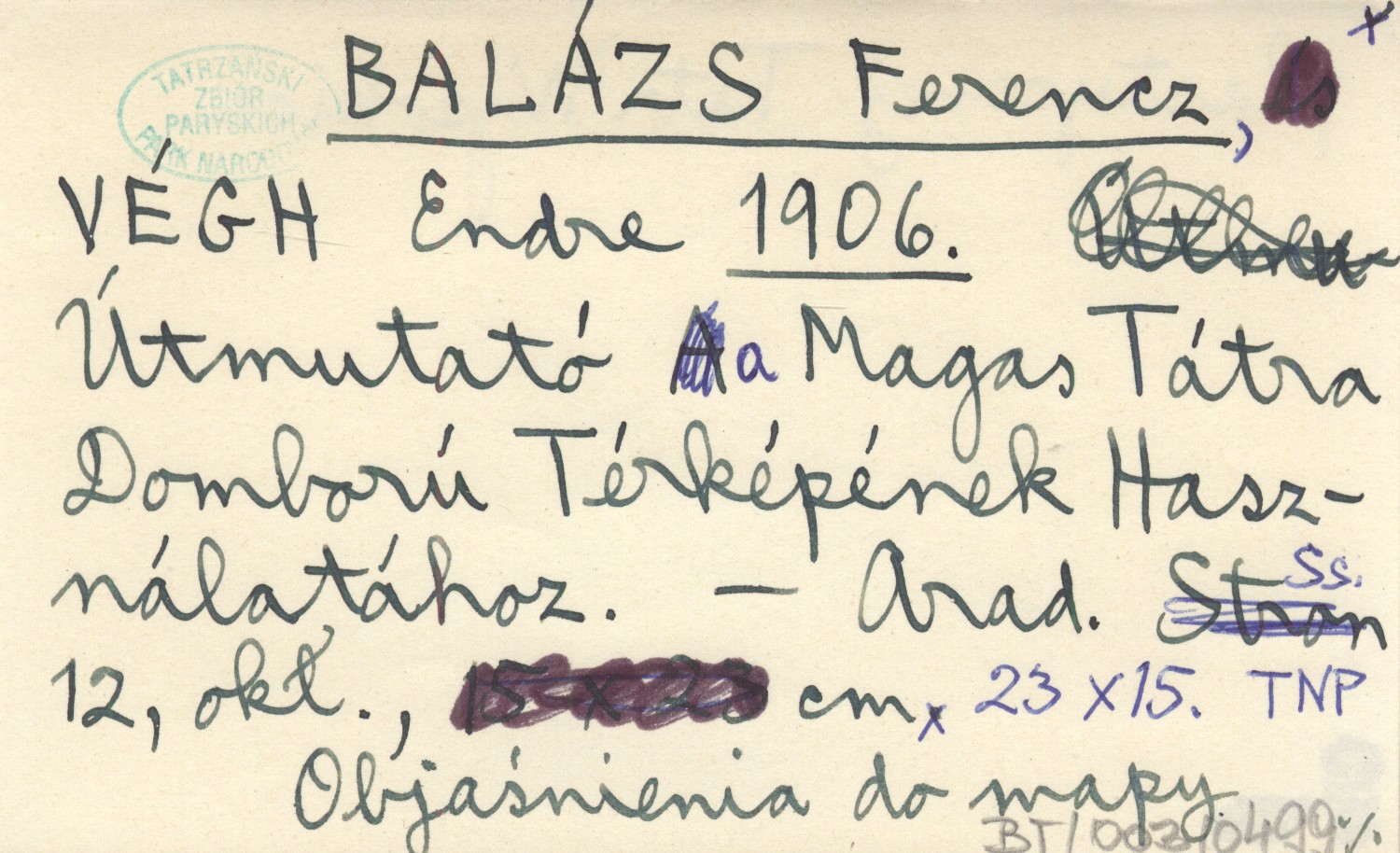 BALÁZS Ferencz VÉGH, Endre. ; 1906 Útmutató a Magas Tátra Domború Térképének Használatához.
