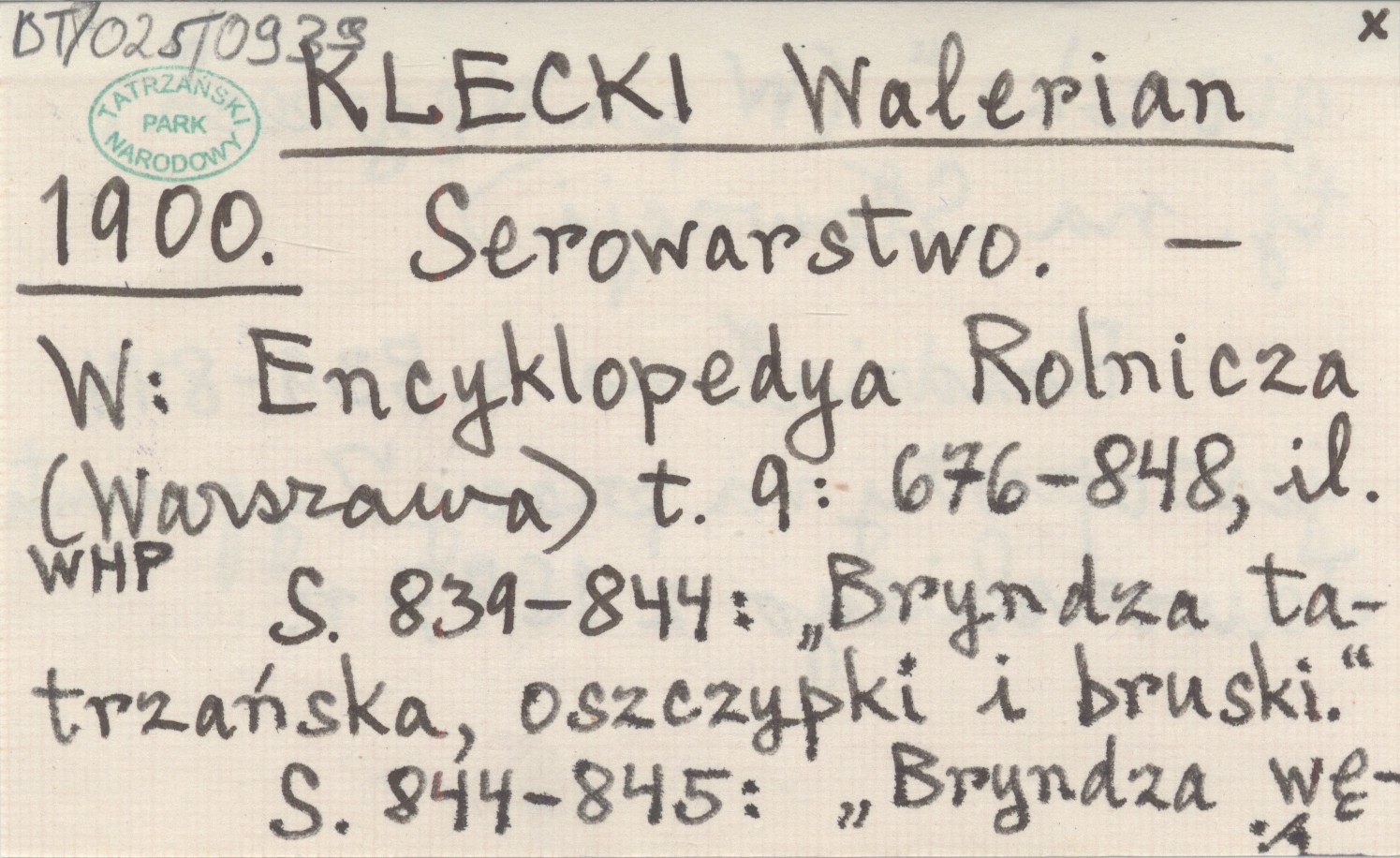 Encyklopedya Rolnicza. Warszawa , T. 9: 676-848, il. S. 839-844: "Bryndza tatrzańska, oszczypki i bruski." S. 844-845: "Bryndza węgierska." (W pn. Węgrzech, tj. na Słowacji.) Rozdział na s. 839-844 jest oparty na pracy Zygmunta Jaworskiego z 1897 r.