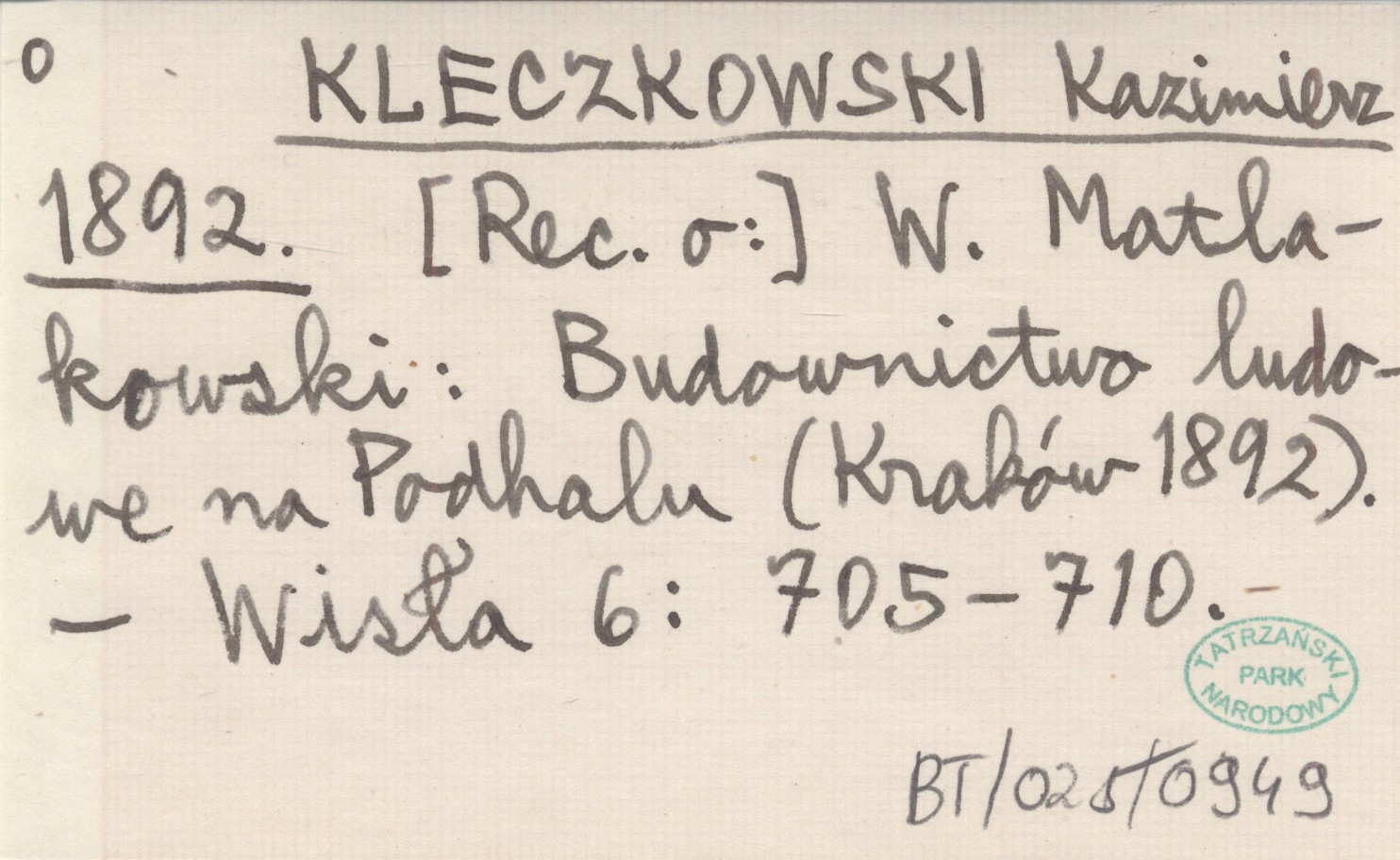 KLECZKOWSKI Kazimierz 1892 W. Matlakowski: Budownictwo ludowe na Podhalu (Kraków 1892).