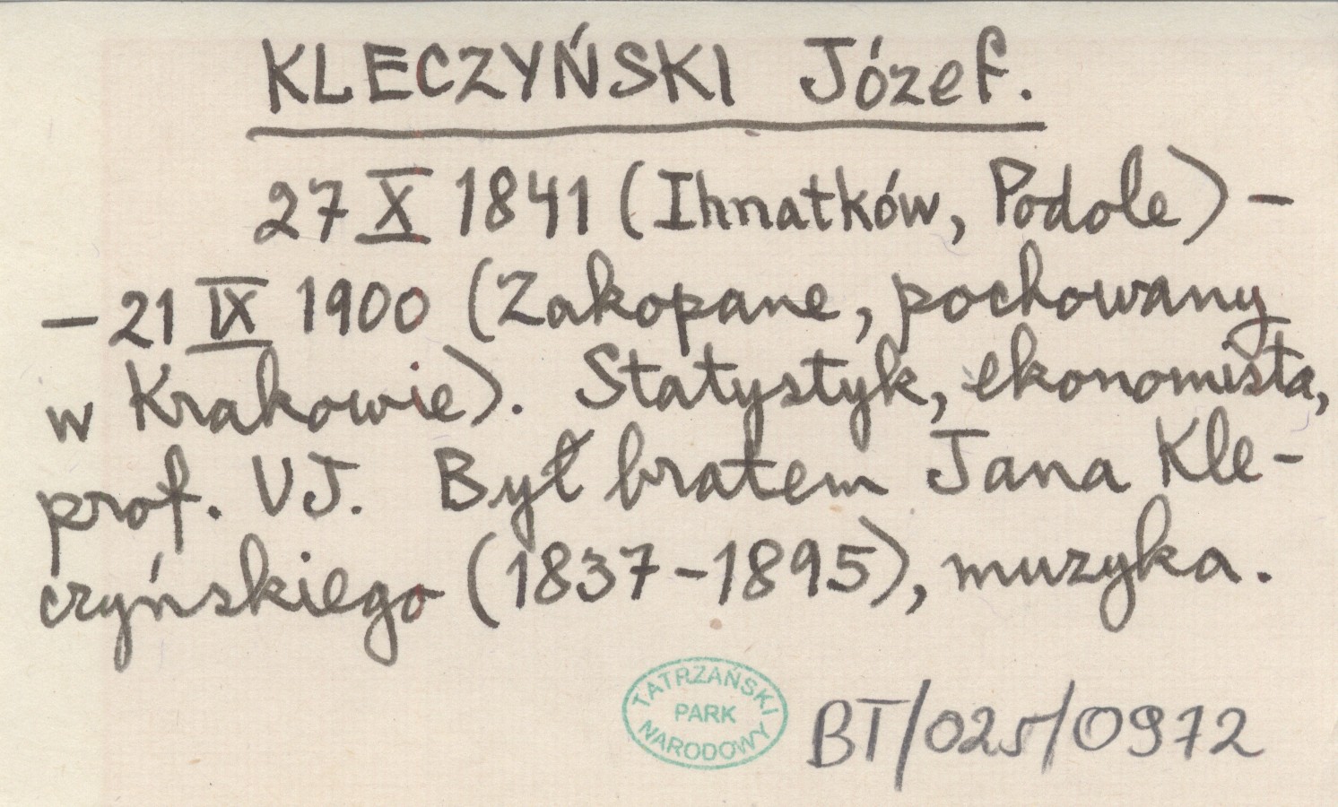 27 X 1841 (Ihnatków, Podole) - 21 IX 1900 (Zakopane, pochowany w Krakowie). Statystyk, ekonomista, prof. UJ. Był bratem Jana Kleczyńskiego (1837-1895), muzyka.