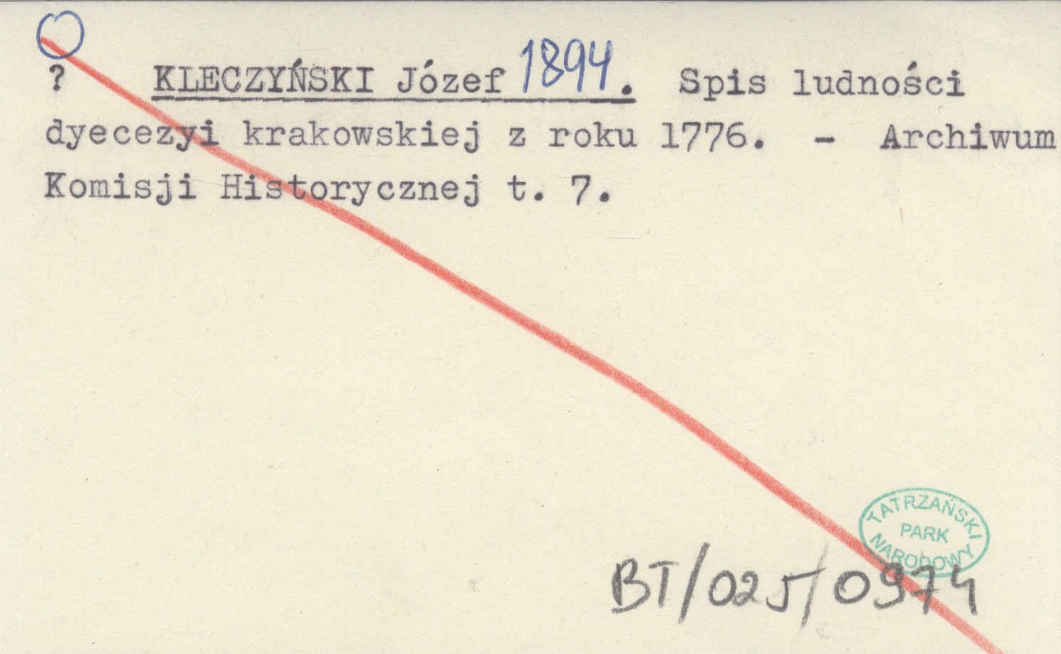 KLECZYŃSKI Józef 1894 Spis ludności dyecezyi krakowskiej z roku 1776.