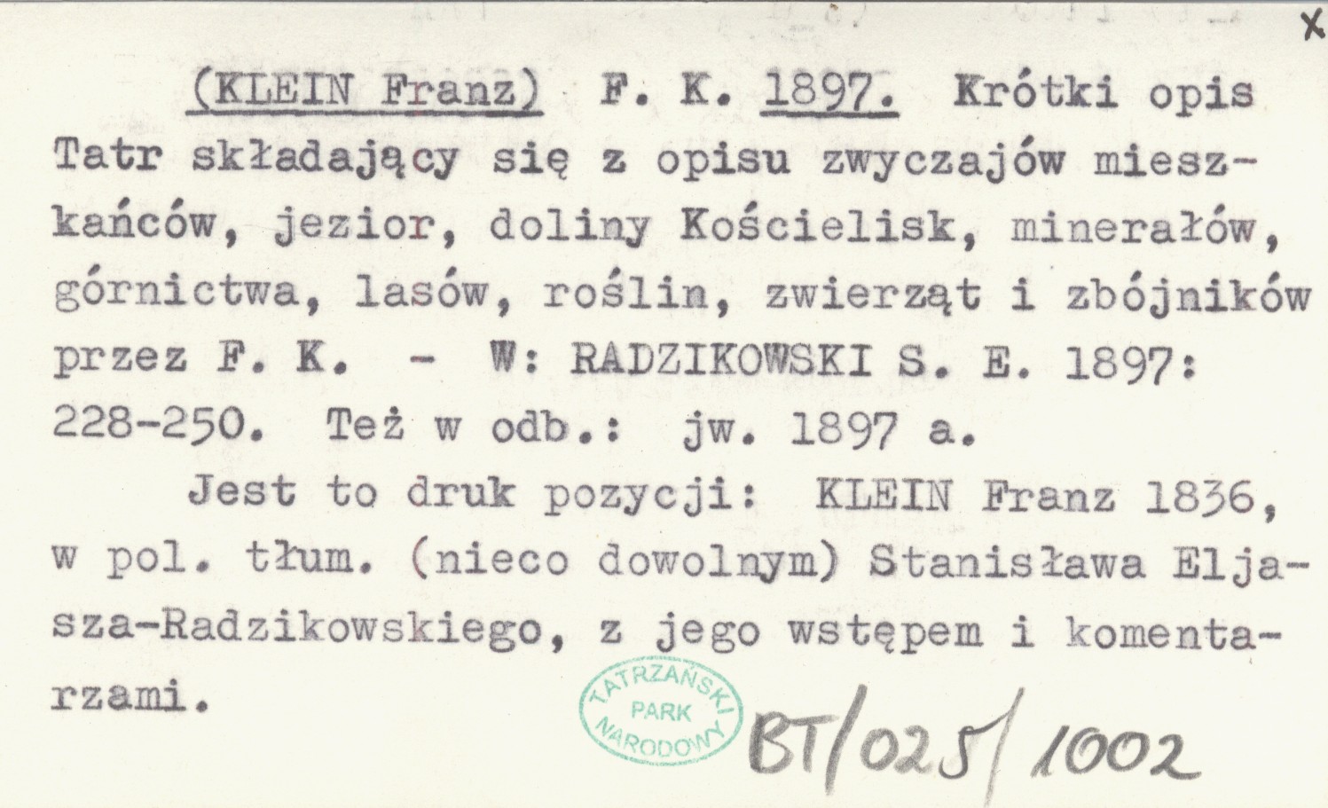 F. K. (KLEIN Franz) 1897 Krótki opis Tatr składający się z opisu zwyczajów mieszkańców, jezior, doliny Kościelisk, minerałów, górnictwa, lasów, roślin, zwierząt i zbójników przez F. K.