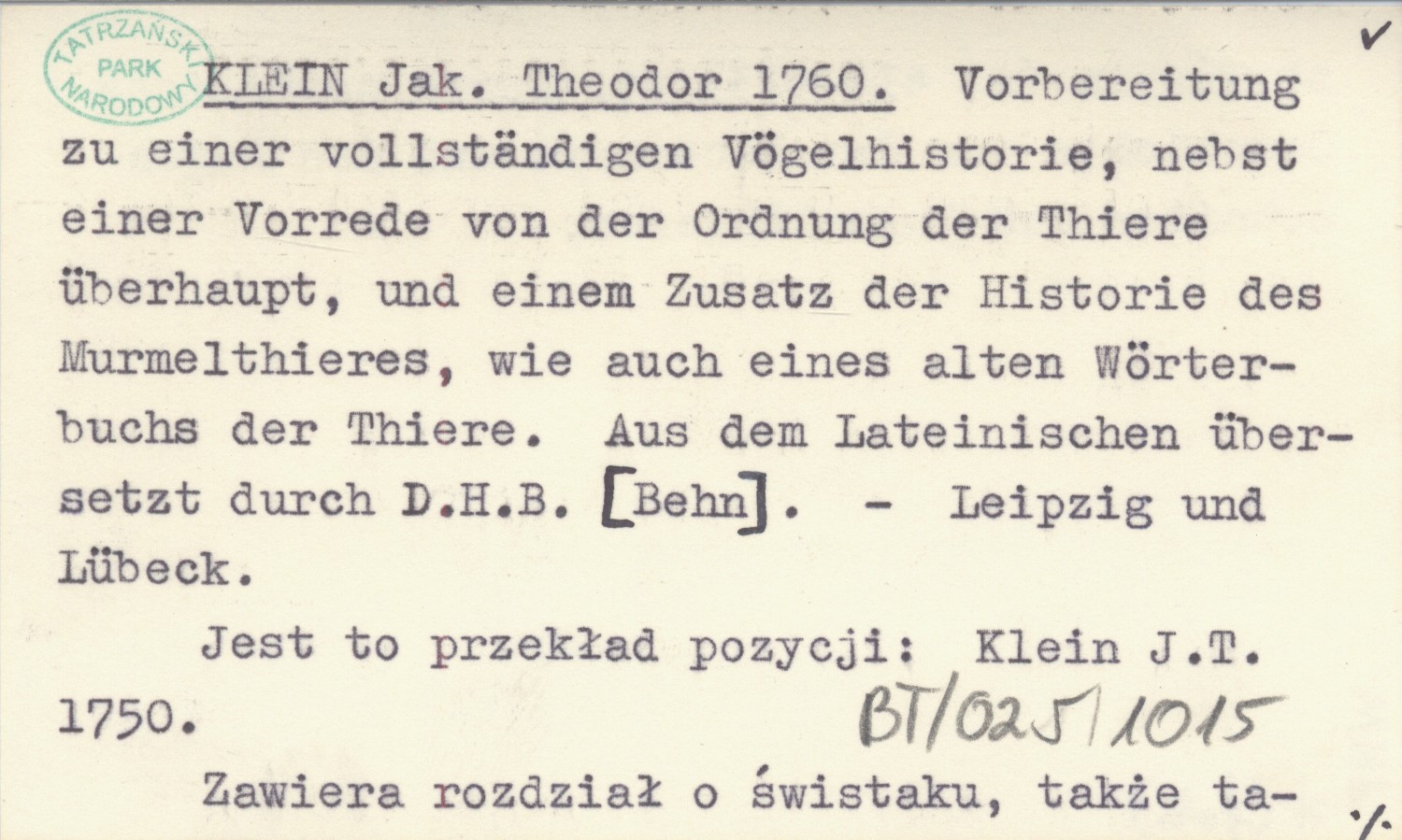 KLEIN Jak. Theodor 1760 Vorbereitung zu einer vollständigen Vögelhistorie, nebst einer Vorrede von der Ordnung der Thiere überhaupt, und einem Zusatz der Historie des Murmelthieres, wie auch eines alten Wörterbuchs der Thiere. Aus dem Lateinischen übersetzt durch D.H.B. [Behn].