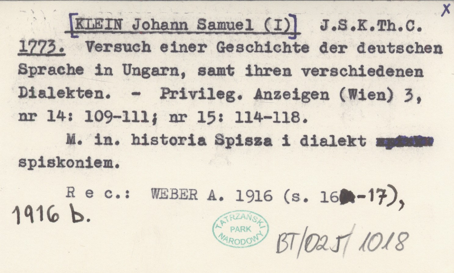 Privileg. Anzeigen (Wien) , 3, nr 14: 109-111; nr 15: 114-118. M.in. historia Spisza i dialekt spiskoniem. REC: WEBER A. 1916 (s. 16-17), 1916 b.