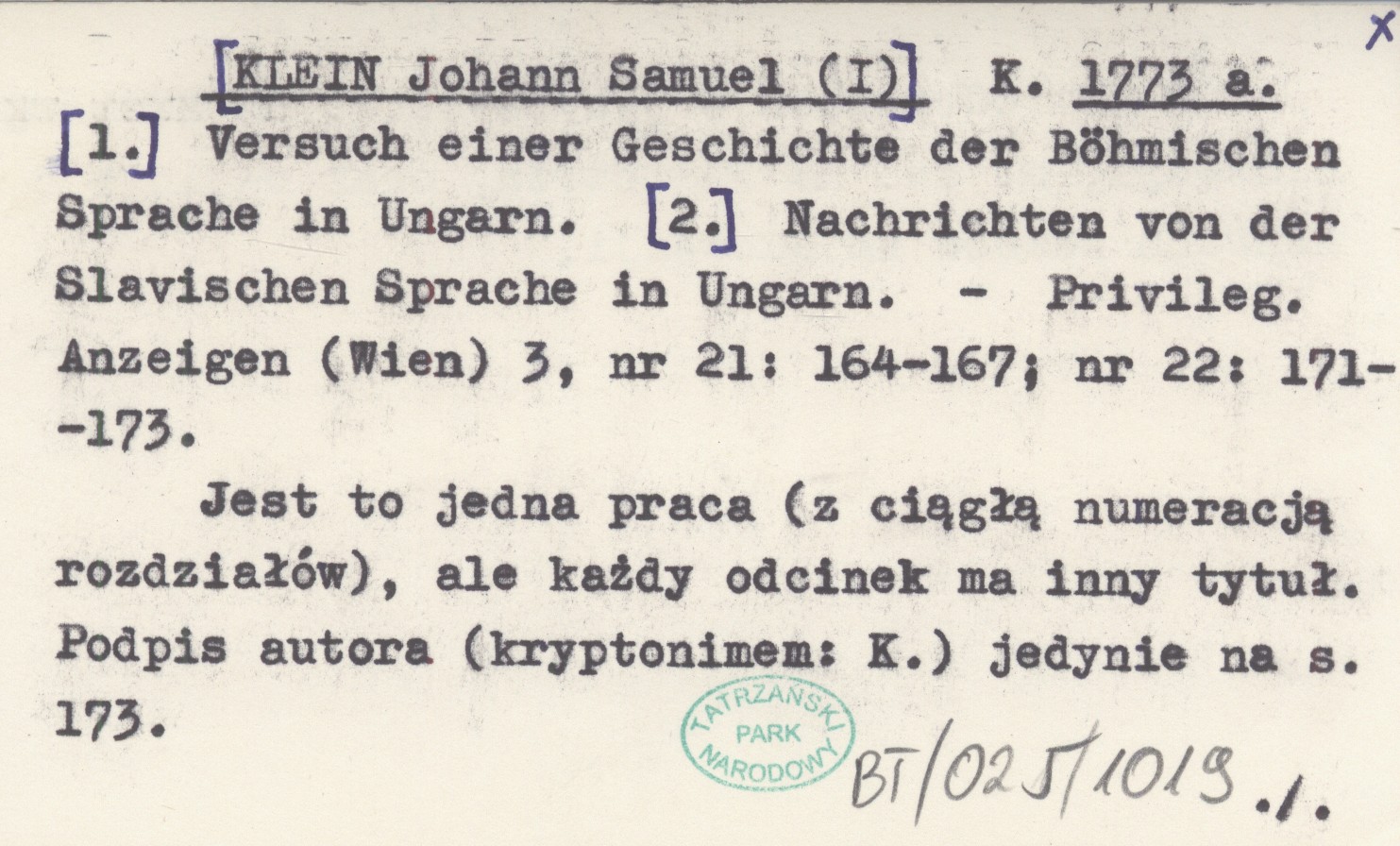 Privileg. Anzeigen (Wien) , 3, nr 21: 164-167; nr 22: 171-173. W obu odcinkach o języku słow. na Słowacji, m.in. na Podtatrzu, oraz ogólnie o nazwach zamków na Słowacji. Jest to jedna praca (z ciągłą numeracją rozdziałów), ale każdy odcinek ma inny tytuł. Podpis autora (kryptonimem: K.) jedynie na s. 173.