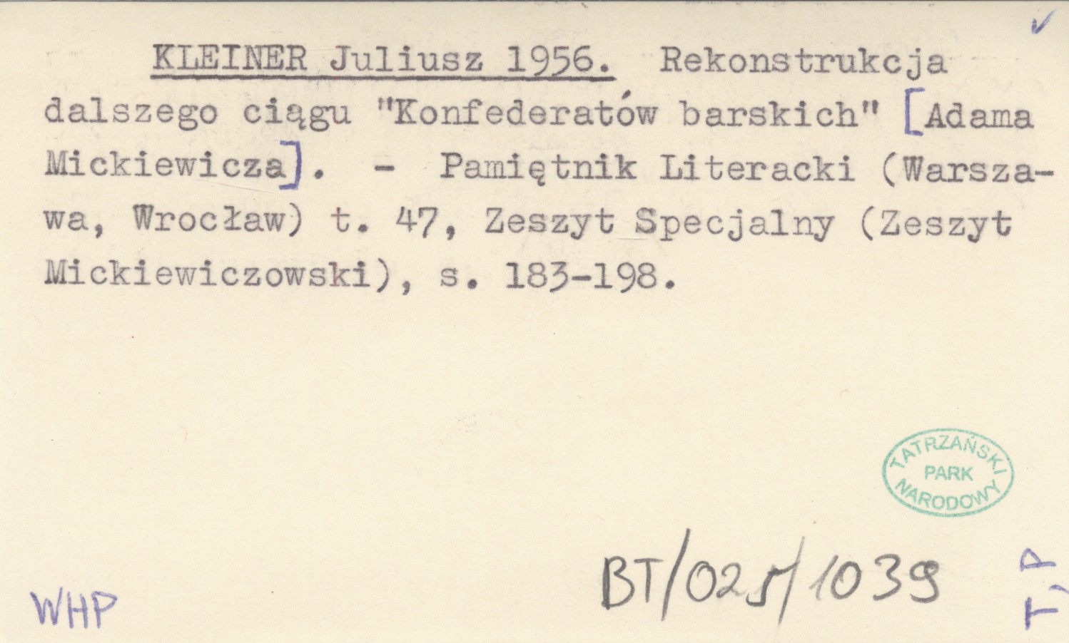 Pamiętnik Literacki, Zeszyt Specjalny (Zeszyt Mickiewiczowski) (Warszawa ; Wrocław ;) , T. 47: 183-198.