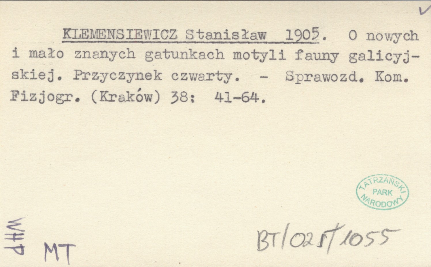 KLEMENSIEWICZ Stanisław 1905 O nowych i mało znanych gatunkach motyli fauny galicyjskiej. Przyczynek czwarty.