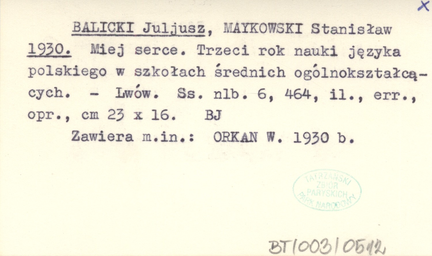 BALICKI Juljusz MAYKOWSKI, Stanisław. ; 1930 Miej serce. Trzeci rok nauki języka polskiego w szkołach średnich ogólnokształcących.
