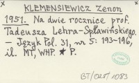 KLEMENSIEWICZ Zenon 1951 Na dwie rocznice prof. Tadeusza Lehra-Spławińskiego.