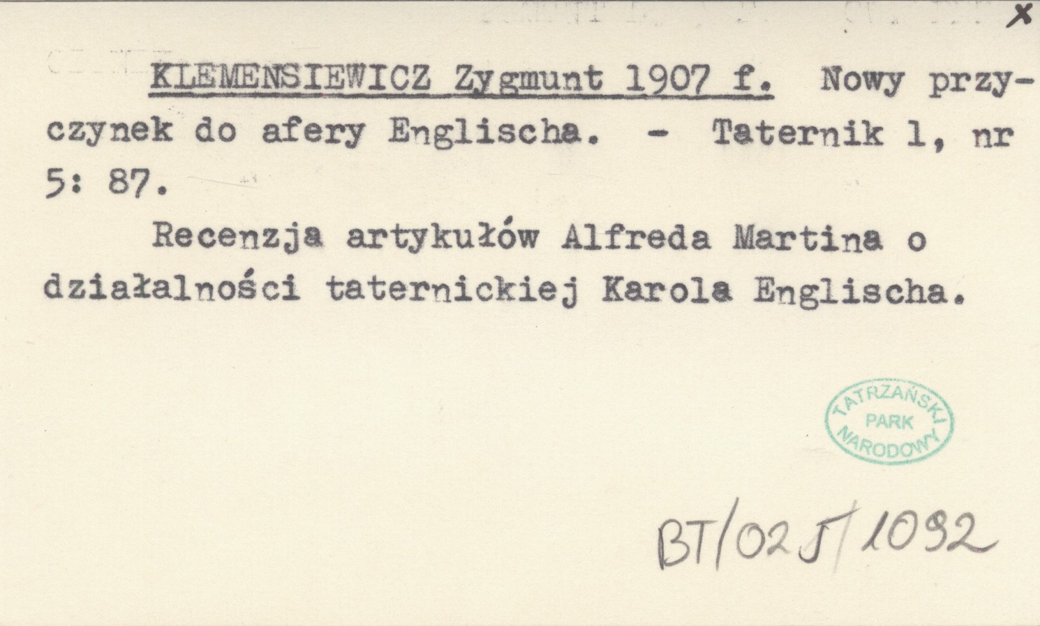 Taternik, 1, nr 5: 87. Recenzja artykułów Alfreda Martina o działalności taternickiej Karola Englischa.