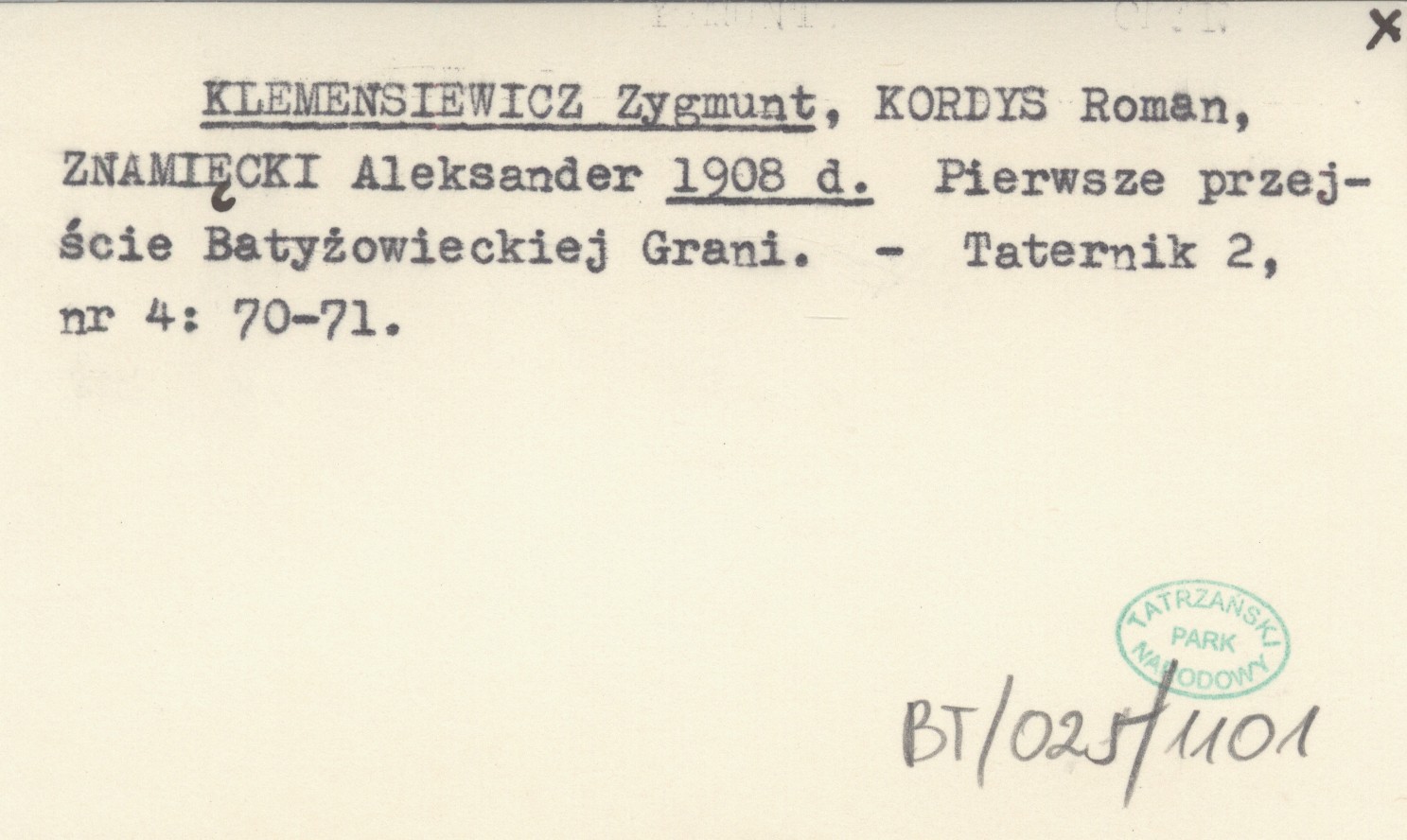 KLEMENSIEWICZ Zygmunt KORDYS, Roman. ; ZNAMIĘCKI, Aleksander. ; 1908 d Pierwsze przejście Batyżowieckiej Grani.