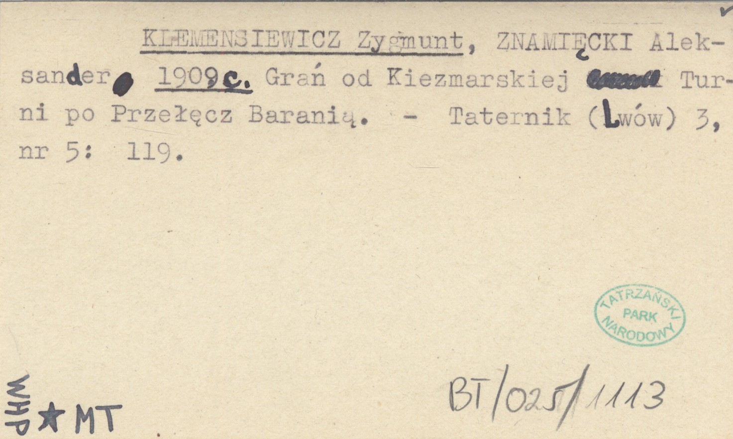 KLEMENSIEWICZ Zygmunt ZNAMIĘCKI, Aleksander. ; 1909 c Grań od Kiezmarskiej Turni po Przełęcz Baranią.