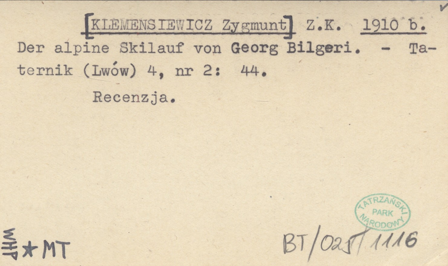 Z. K. [KLEMENSIEWICZ Zygmunt] 1910 b Der alpine Skilauf von Georg Bilgeri.