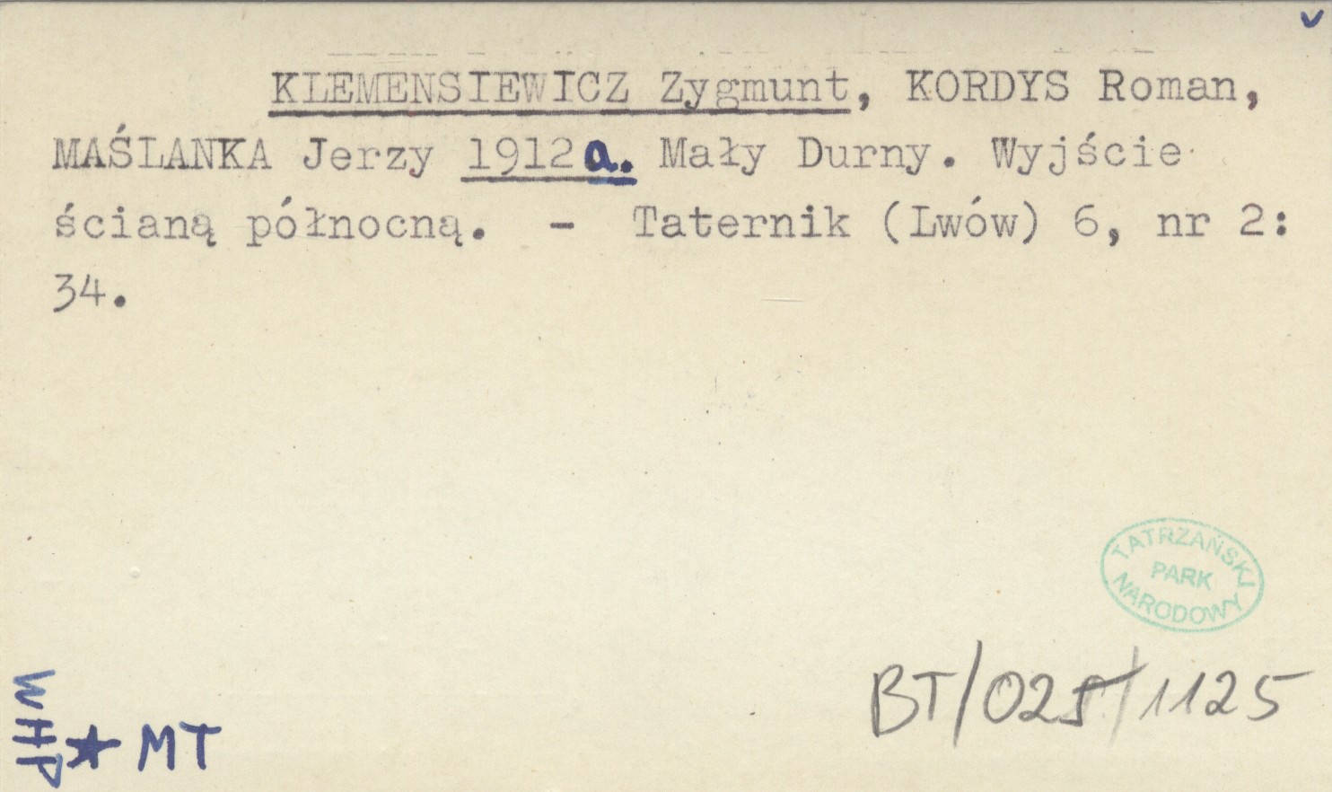 KLEMENSIEWICZ Zygmunt KORDYS, Roman. ; MAŚLANKA, Jerzy. ; 1912 a Mały Durny. Wyjście ścianą północną.