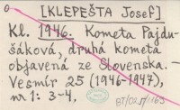 Kl. [KLEPEŠTA Josef] 1946 Kometa Pajdušáková, druhá kometa objavená ze Slovenska.