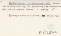 KLESCH Daniel Christophorus 1674 Wahrhafte Beschreibung und Erzählung der besondern Schicksale meines Vaters.
