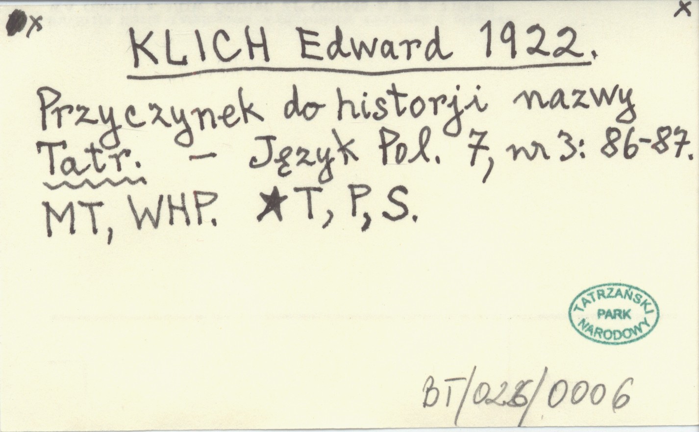 KLICH Edward 1922 Przyczynek do historji nazwy Tatr.