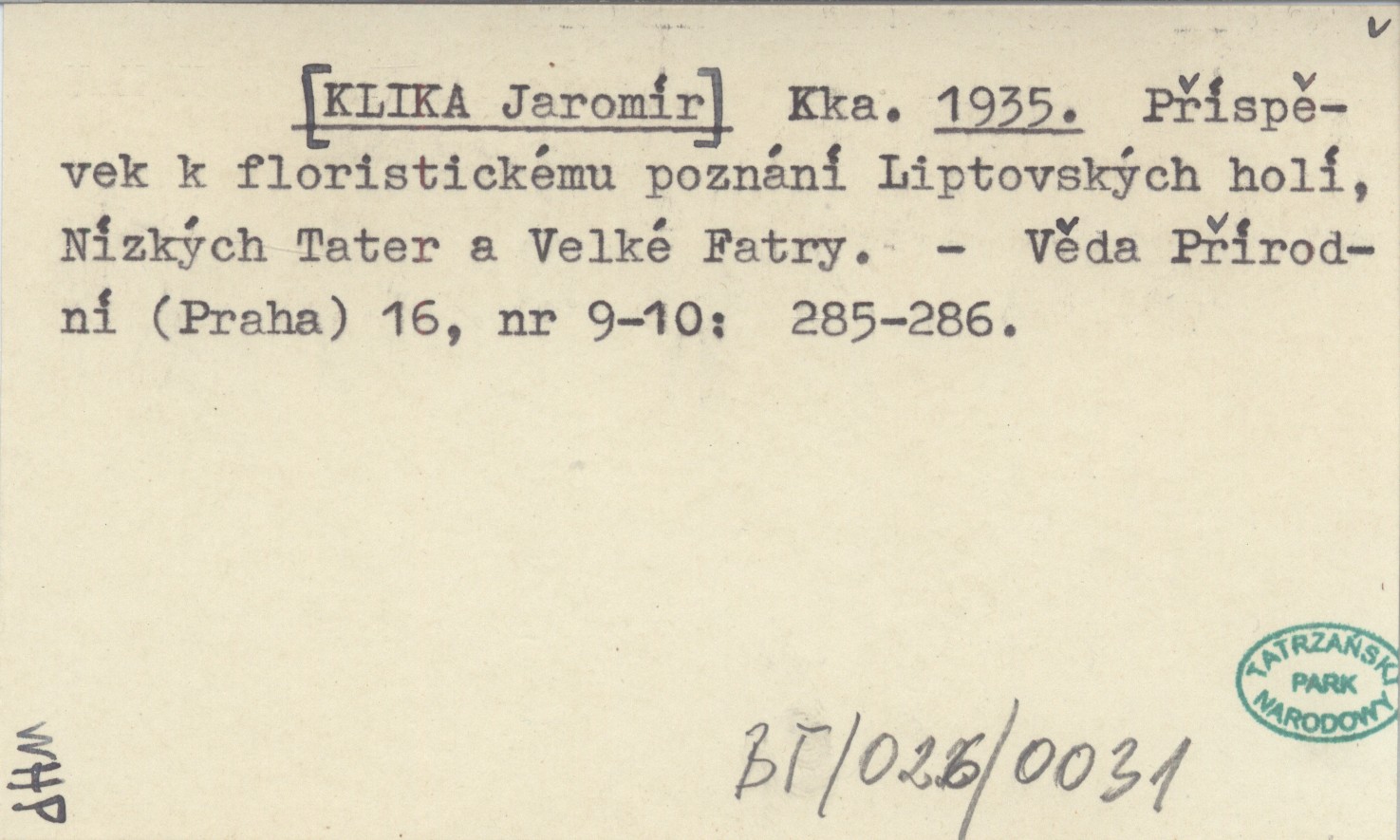Kka. [KLIKA Jaromír] 1935 Příspěvek k floristickému poznání Liptovských holí, Nízkých Tater a Velké Fatry.