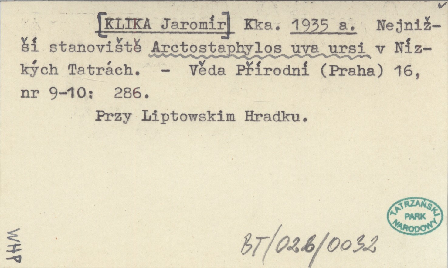 Kka. [KLIKA Jaromír] 1935 a Najnižší stanoviště Arctostaphylos uva ursi v Nízkých Tatrách.