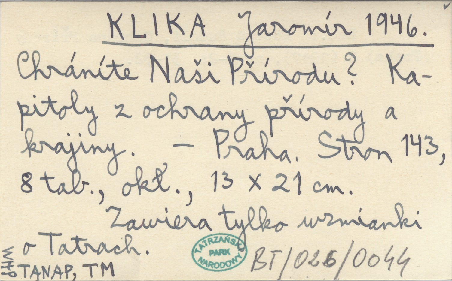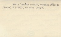 Praha , 143 s., 8 k. tabl., okł., 13x21 cm. Zawiera tylko wzmianki o Tatrach. REC: MOUČKA Rudolf, Ochrana Přírody (Praha) 2 (1947), nr 1-2: 31-32.
