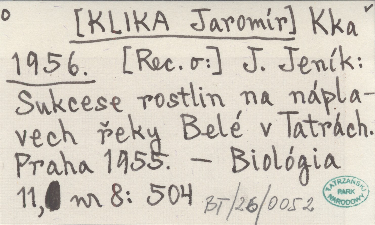 Kka [KLIKA Jaromír] 1956 J. Jeník: Sukcese rostlin na náplavech řeky Belé v Tatrách. Praha 1955.