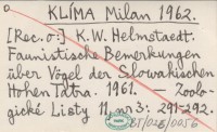 KLÍMA Milan 1962 K. W. Helmstaedt: Faunistische Bemerkungen über Vögel der Slowakischen Hohen Tatra. 1961.