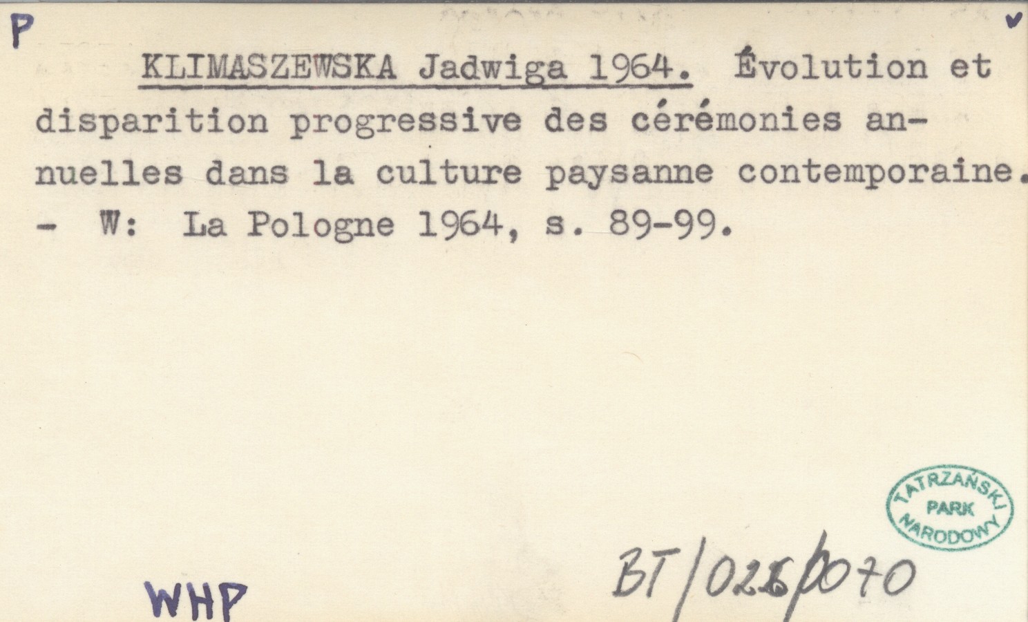 KLIMASZEWSKA Jadwiga 1964 Évolution et disparition progressive des cérémonies annuelles dans la culture paysanne contemporaine.