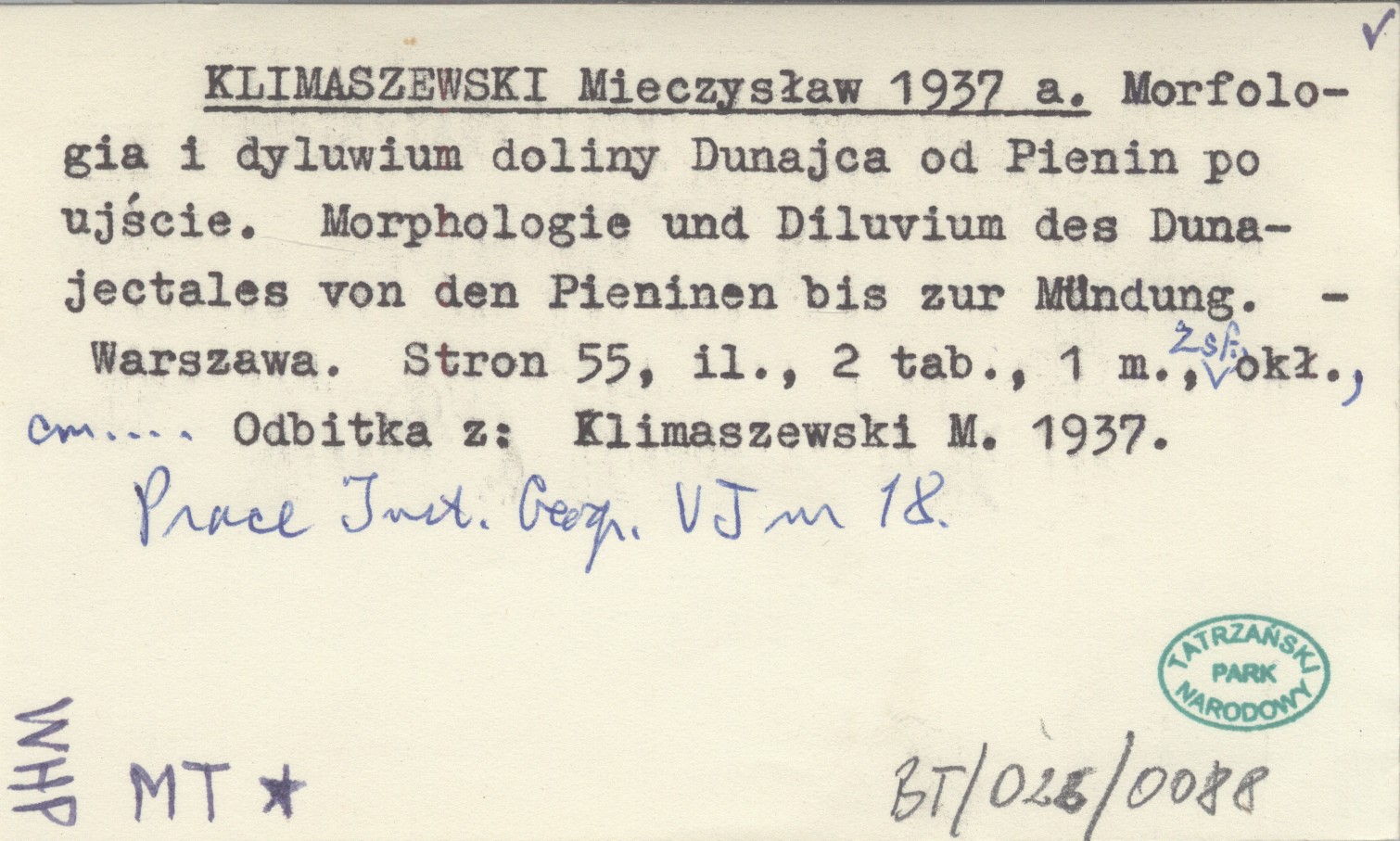KLIMASZEWSKI Mieczysław 1937 a Morfologia i dyluwium doliny Dunajca od Pienin po ujście. Morphologie und Diluvium des Dunajectales von den Pieninen bis zur Mündung.