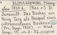 KLIMASZEWSKI Mieczysław 1937 d D. Jaranoff: Das Becken von Nowy Targ als Beispiel eines intramontanen Beckens (Prz. Geogr. 1935).