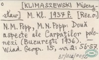 M. Kl. [KLIMASZEWSKI Mieczysław] 1937 f N. M. Popp, M. N. Popp: Donă aspecte ale Carpaţilor polonezi (Bucureşti 1936).