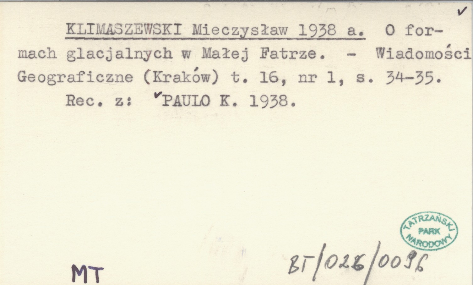 KLIMASZEWSKI Mieczysław 1938 a O formach glacjalnych w Małej Fatrze.