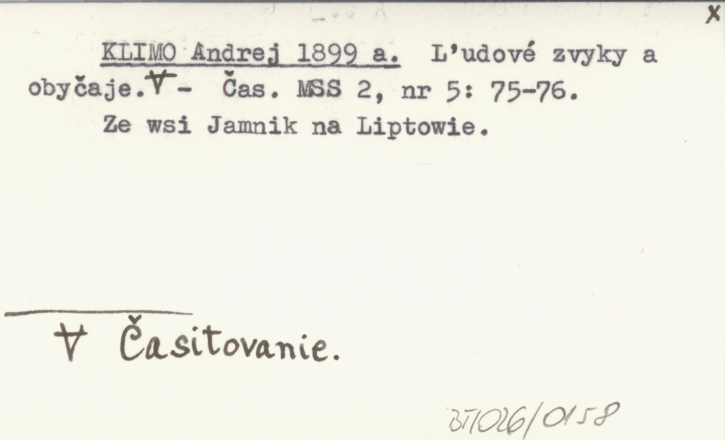 KLIMO Andrej 1899 a Ľudové zvyky a obyčaje. Časitovanie.
