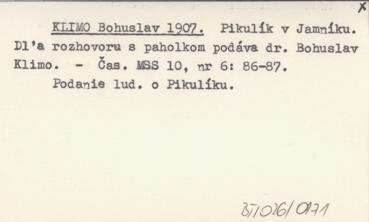 KLIMO Bohuslav 1907 Pikulík v Jamníku. Dľa rozhovoru s paholkom podáva dr. Bohuslav Klimo.