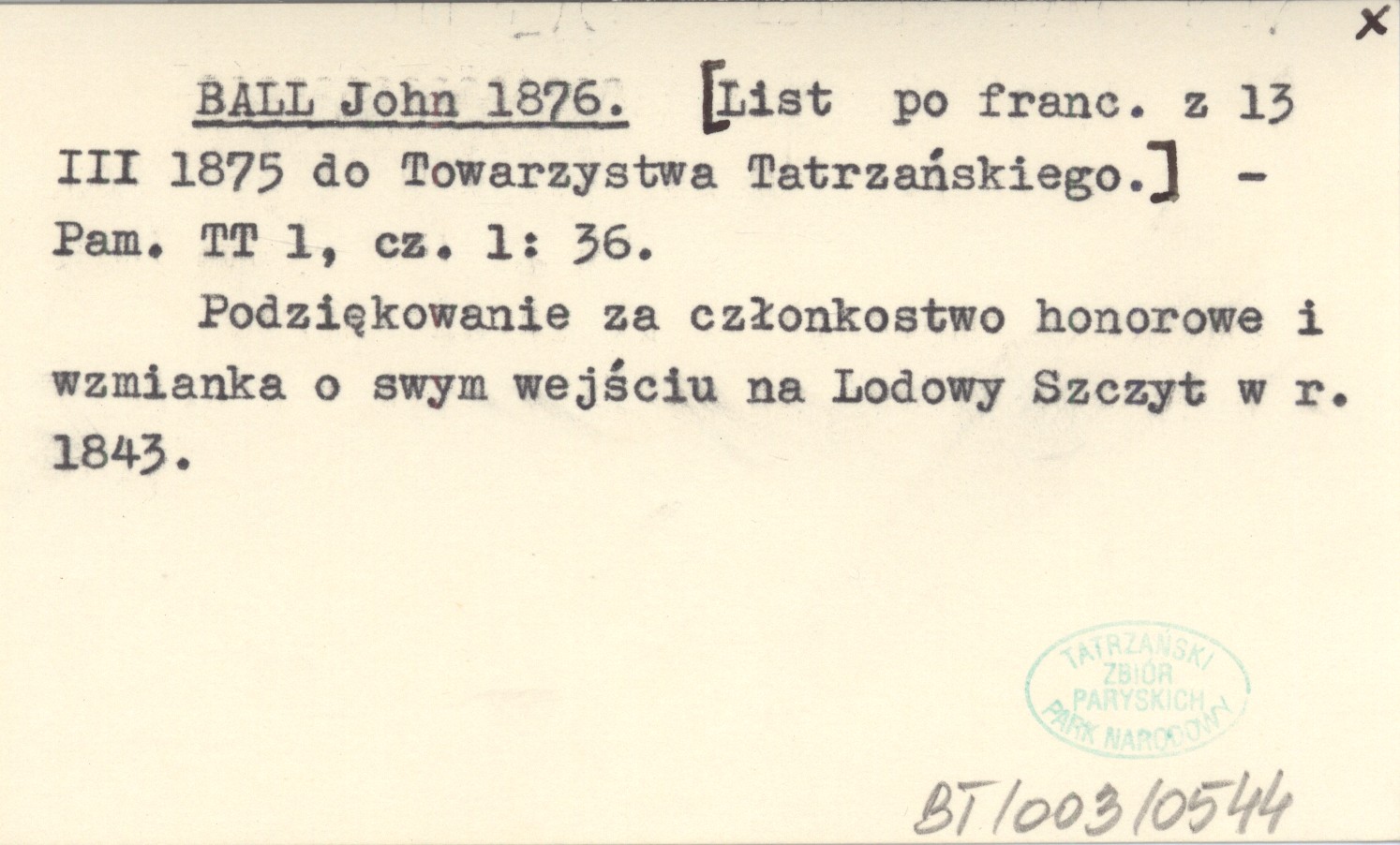 BALL John 1876 [List po franc. z 13 III 1875 do Towarzystwa Tatrzańskiego.]