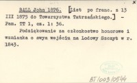 BALL John 1876 [List po franc. z 13 III 1875 do Towarzystwa Tatrzańskiego.]