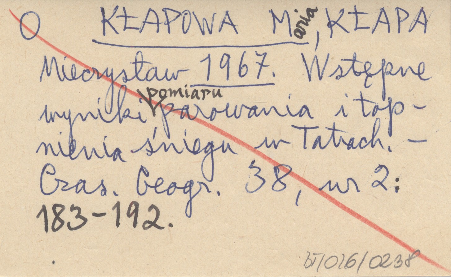 KŁAPOWA Maria KŁAPA, Mieczysław. ; 1967 Wstępne wyniki pomiaru parowania i topnienia śniegu w Tatrach.