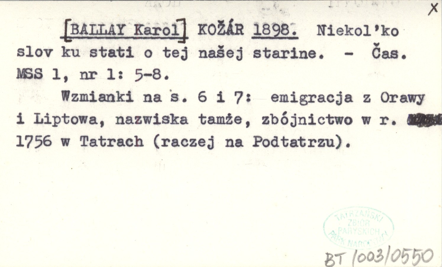 Časopis Muzeálnej Slovenskej Spoločnosti, 1, nr 1: 5-8. Wzmianki na s. 6 i 7: emigracja z Orawy i Liptowa, nazwiska tamże, zbójnictwo w r. 1756 w Tatrach (raczej na Podtatrzu).