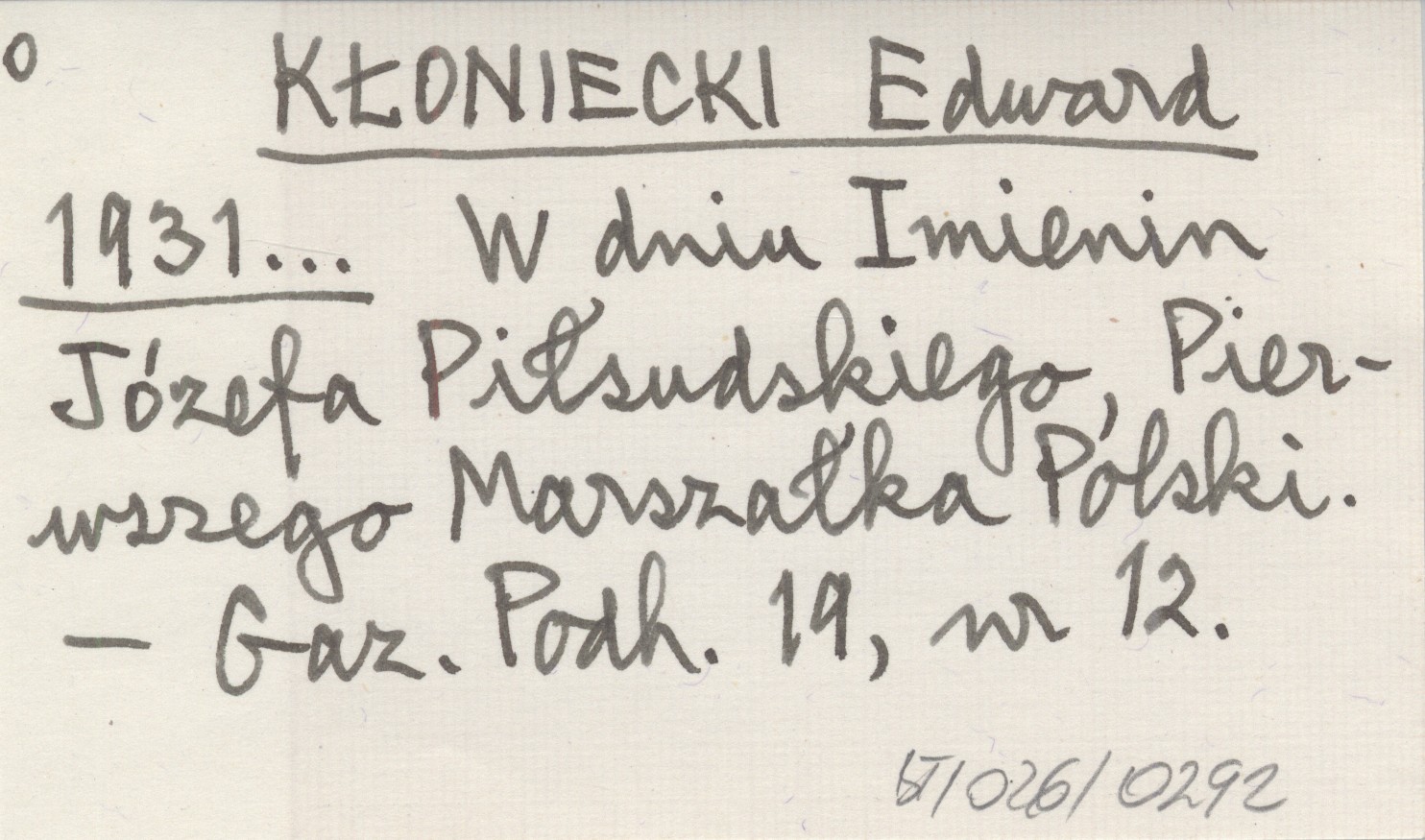 KŁONIECKI Edward 1931... W dniu Imienin Józefa Piłsudskiego, Pierwszego Marszałka Polski.