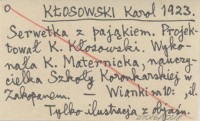 KŁOSOWSKI Karol 1923 Serwetka z pająkiem. Projektował K. Kłosowski. Wykonała K. Maternicka, nauczycielka Szkoły Koronkarskiej w Zakopanem.